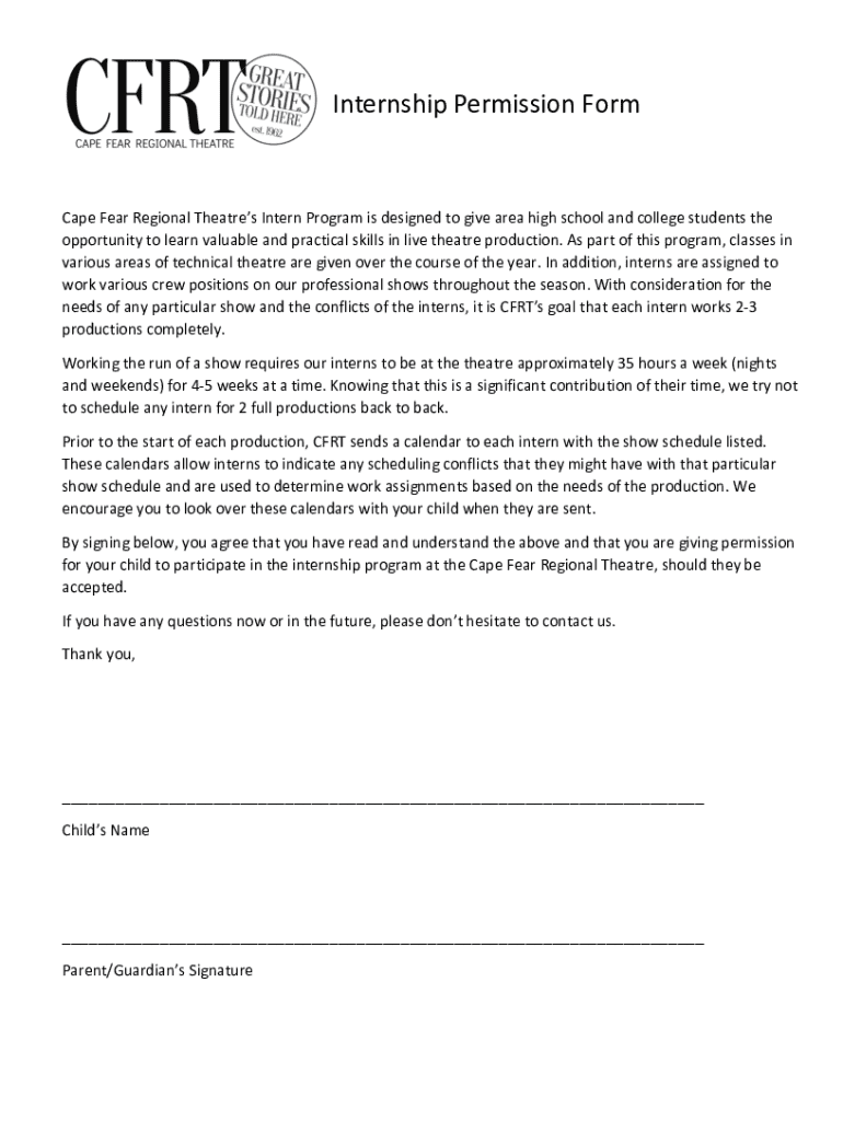 Internship Permission FormCape Fear Regional Theatres Intern Program is designed to give area high school and college students the opportunity to learn valuable and practical skills in live theatre