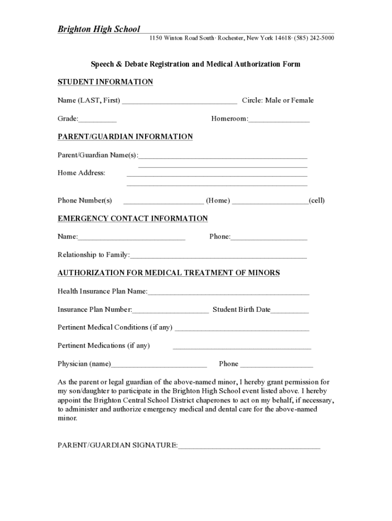 Brighton High School 1150 Winton Road South Rochester, New York 14618 (585) 2425000Speech & Debate Registration and Medical Authorization Form STUDENT INFORMATION Name (LAST, First) ___ Circle: Male