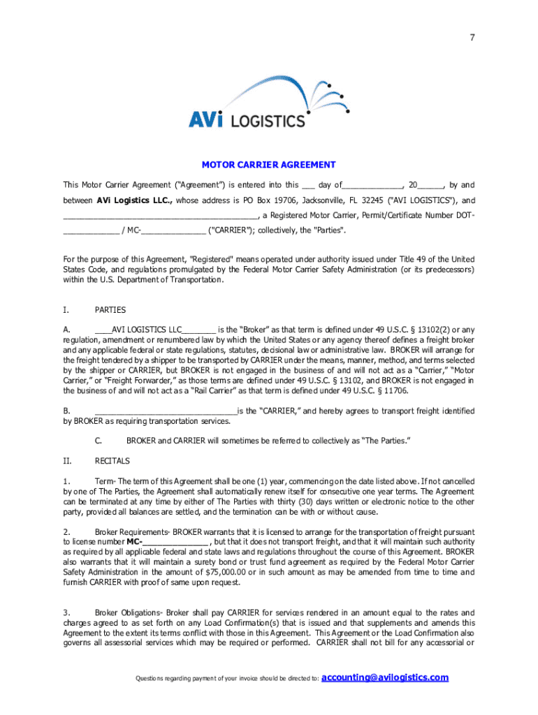 7MOTOR CARRIER AGREEMENT This Motor Carrier Agreement (Agreement) is entered into this ___ day of___, 20___, by and between AVi Logistics LLC., whose address is PO Box 19706, Jacksonville, FL 32245