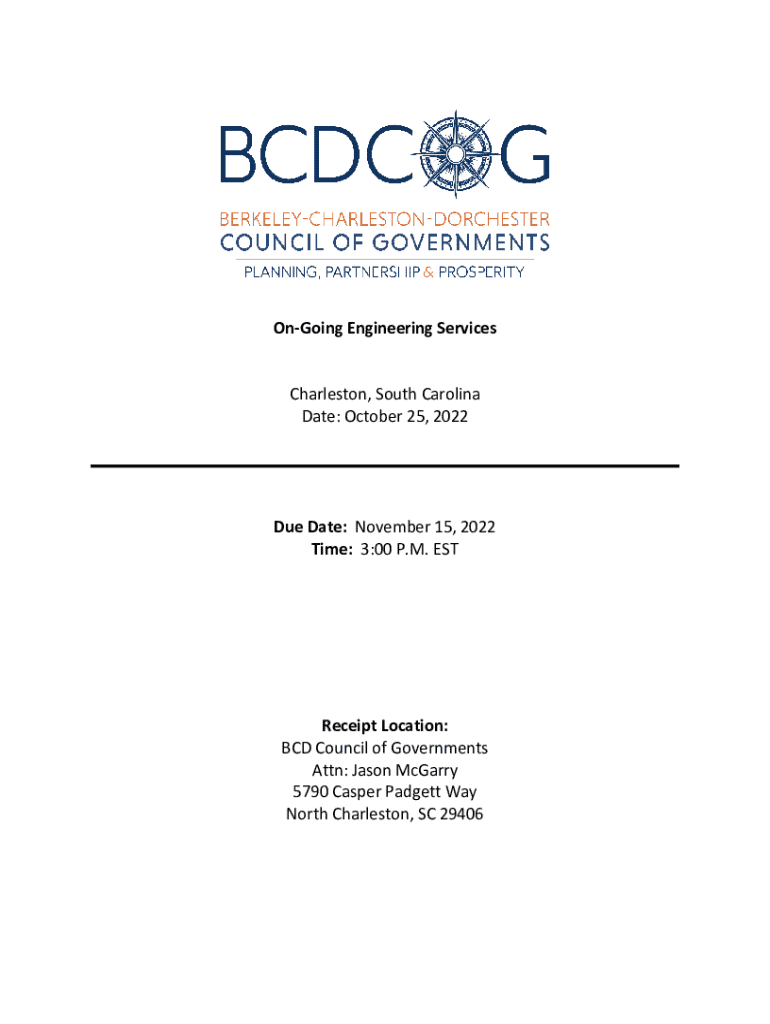Ongoing Engineering Services Charleston, South Carolina Date: October 25, 2022Due Date: November 15, 2022, Time: 3:00 P.M. Receipt Location: BCD Council of Governments Attn: Jason McGorry 5790 Casper