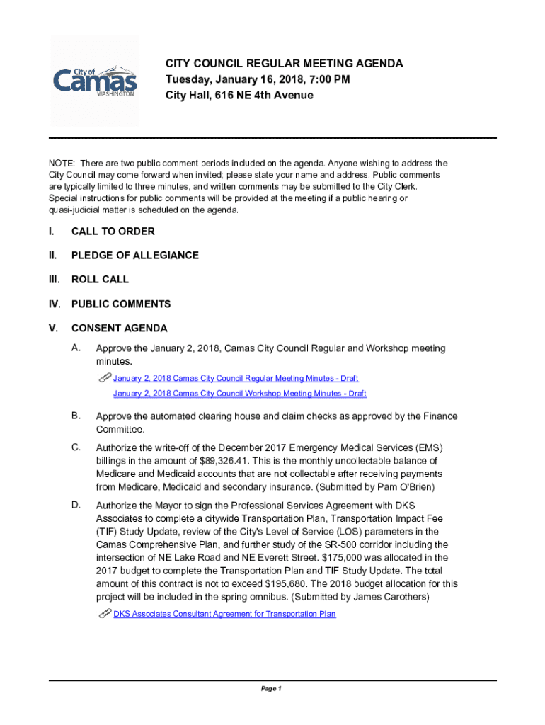 CITY COUNCIL REGULAR MEETING AGENDA Tuesday, January 16, 2018, 7:00 PM City Hall, 616 NE 4th AvenueNOTE: There are two public comment periods included on the agenda. Anyone wishing to address the