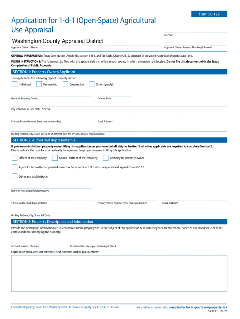 Form 50129Application for 1d1 (OpenS pace) Agricultural Use AppraisalForm 50129___ Tax Year Washington County Appraisal District ______Appraisal Districts Reappraisal District Account Number (if known)GENERAL