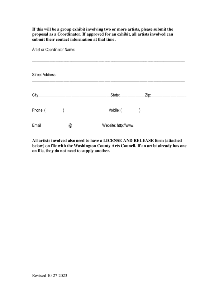 34 S. Potomac St., Suite 100, Hagerstown, MD 21740 301.791.3132 www.washingtoncountyarts.comExhibit Proposal Main Gallery Solo or Small Group Show The GalleryThank you for your interest in exhibiting