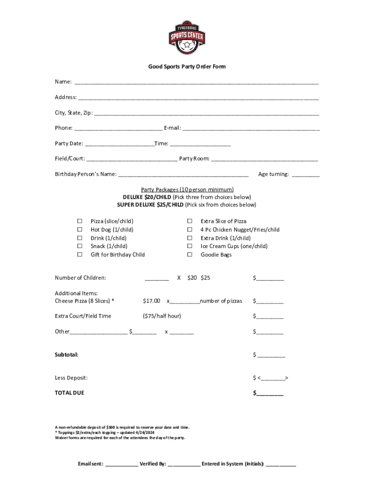 Good Sports Party Order Form Name: ___ Address: ___ City, State, Zip: ___ Phone: ___ Email: ___ Party Date: ___Time: ___ Field/Court: ___ Party Room: ___ Birthday Persons Name: ___Age turning: ___Party