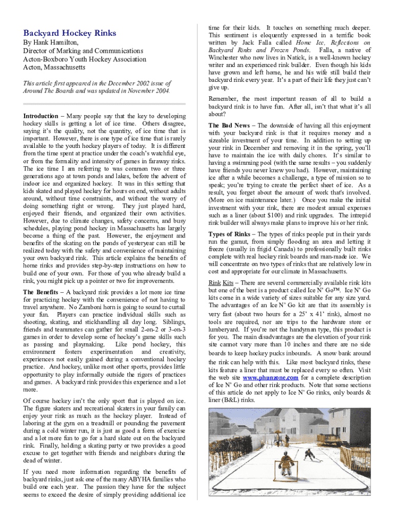 Backyard Hockey Rinks By Hank Hamilton, Director of Marking and Communications ActonBoxboro Youth Hockey Association Acton, Massachusetts This article first appeared in the December 2002 issue of