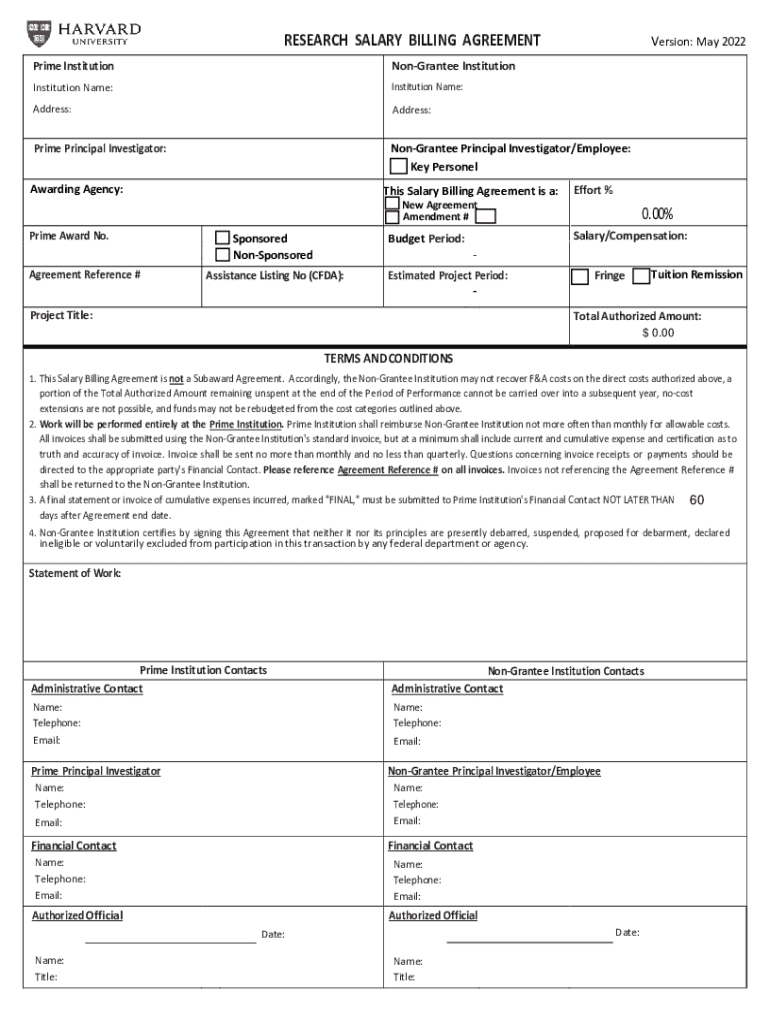 RESEARCH SALARY BILLING AGREEMENTVersion: May 2022Prime InstitutionNonGrantee InstitutionInstitution Name:Institution Name:Address:Address:Prime Principal Investigator:NonGrantee Principal Investigator/Employee: