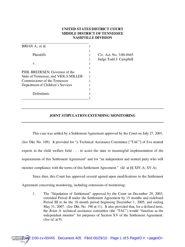 UNITED STATES DISTRICT COURT MIDDLE DISTRICT OF TENNESSEE NASHVILLE DIVISION ___ BRIAN A., et al.) ) Plaintiffs) CIV. Act. No. 3:000445) Judge Todd J. Campbell v.) ) PHIL REDESIGN, Governor of the)