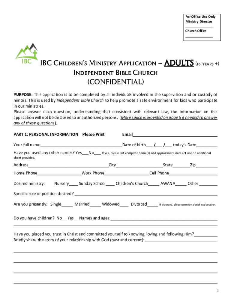 For Office Use Only Ministry Director Church Office IBC Children's Ministry Application ADULTS (18 years +) Independent Bible Church (CONFIDENTIAL) PURPOSE: This application is to be completed by