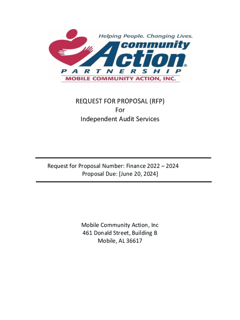 REQUEST FOR PROPOSAL (RFP) For Independent Audit ServicesRequest for Proposal Number: Finance 2022 2024 Proposal Due: [June 20, 2024]Mobile Community Action, Inc 461 Donald Street, Building B Mobile,