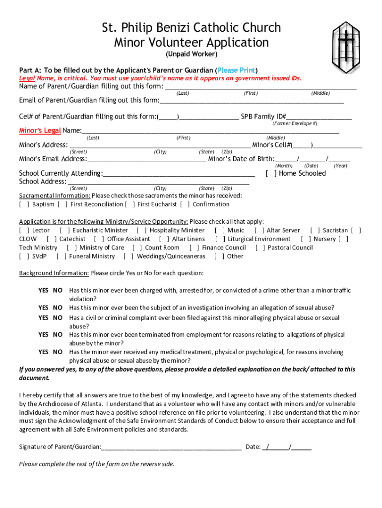 St. Philip Benizi Catholic Church Minor Volunteer Application (Unpaid Worker)Part A: To be filled out by the Applicant\'s Parent or Guardian (Please Print)Legal Name, is critical. You must use your/childs