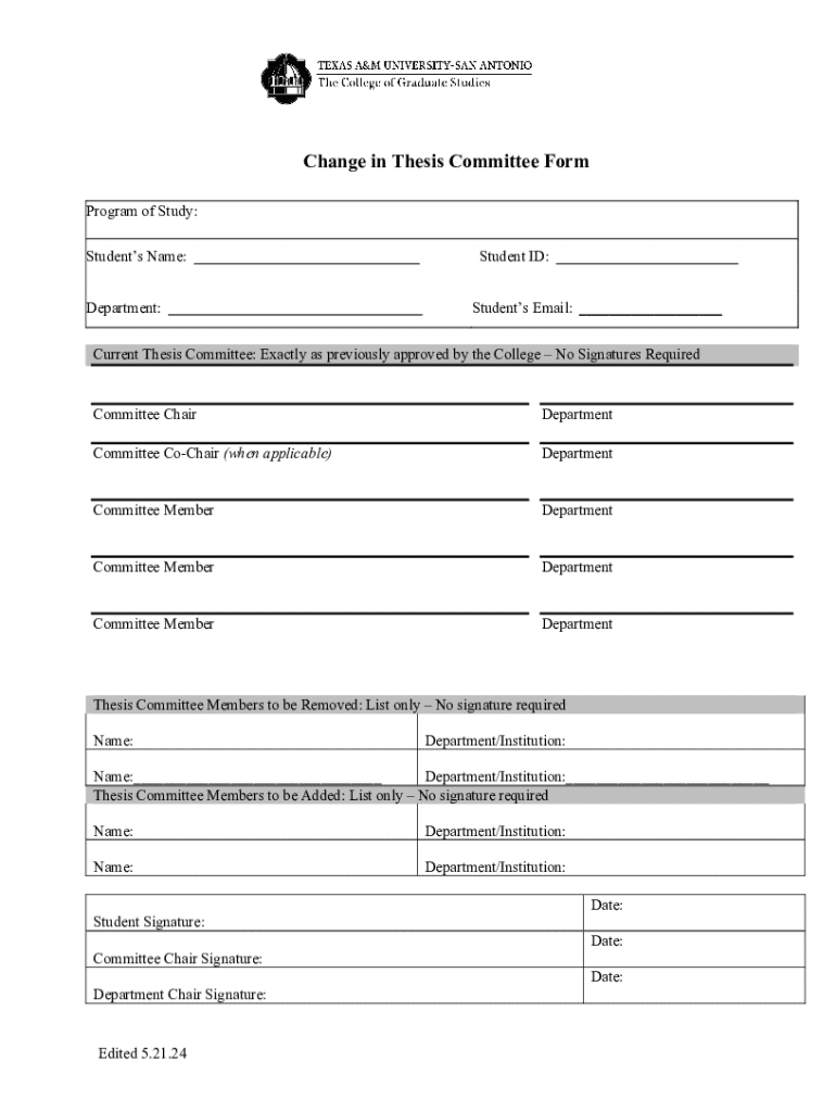 Change in Thesis Committee Form Program of Study: Students Name: Department:Student ID: Students Email: ___Current Thesis Committee: Exactly as previously approved by the College No Signatures RequiredCommittee
