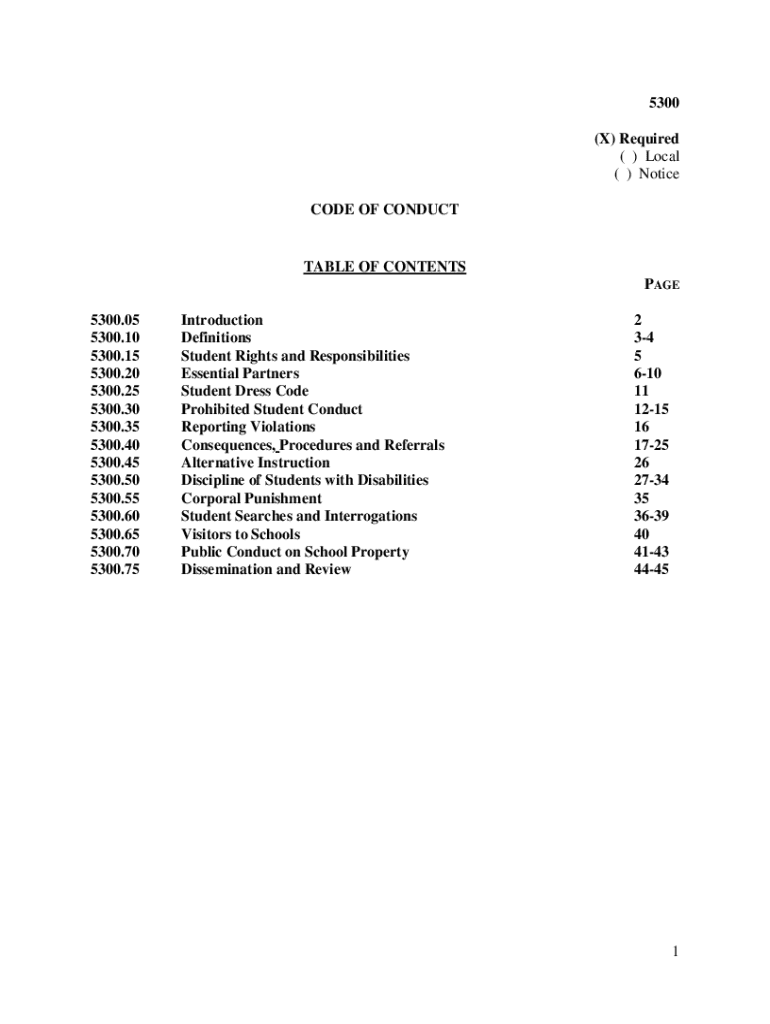 5300 (X) Required () Local () Notice CODE OF CONDUCTIBLE OF CONTENTS PAGE 5300.05 5300.10 5300.15 5300.20 5300.25 5300.30 5300.35 5300.40 5300.45 5300.50 5300.55 5300.60 5300.65 5300.70 5300.75Introduction