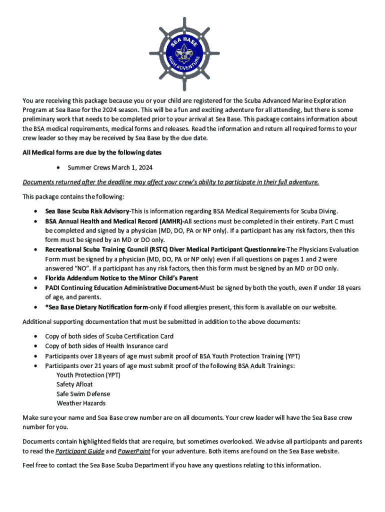 You are receiving this package because you or your child are registered for the Scuba Advanced Marine Exploration Program at Sea Base for the 2024 season. This will be a fun and exciting adventure