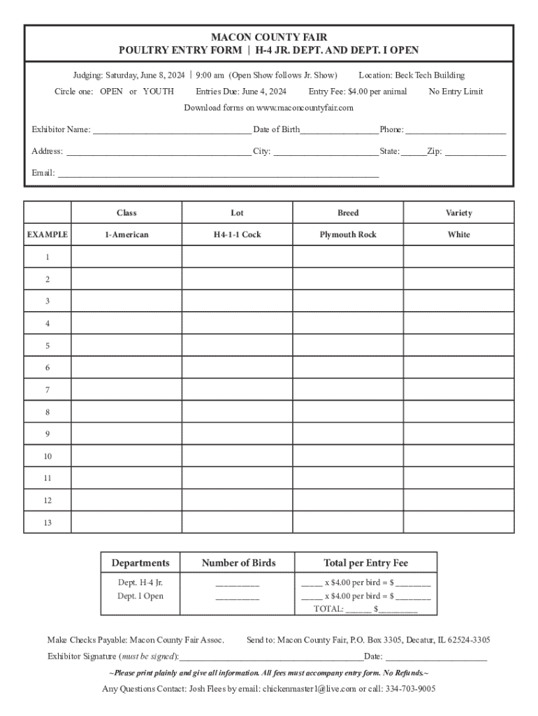 MACON COUNTY FAIR POULTRY ENTRY FORM | H₄ JR. DEPT. AND DEPT. I OPEN Judging: Saturday, June 8, 2024 | 9:00 am (Open Show follows Jr. Show) Circle one: OPEN or Yoctohenries Due: June 4, 2024Location: