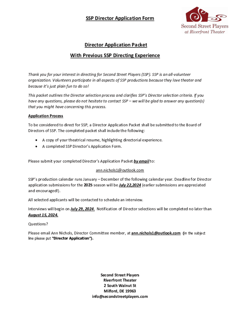 SSP Director Application FormDirector Application Packet With Previous SSP Directing Experience Thank you for your interest in directing for Second Street Players (SSP). SSP is an allvolunteer organization.