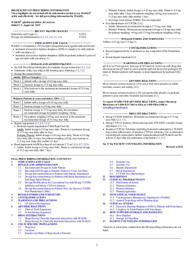 HIGHLIGHTS OF PRESCRIBING INFORMATION These highlights do not include all the information needed to use WAKIX safely and effectively. See full prescribing information for WAKIX.o Pediatric Patients: