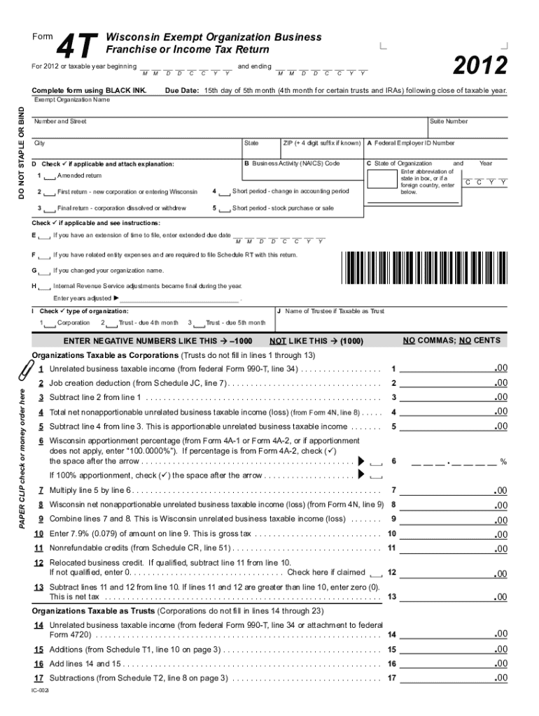Form Wisconsin Exempt Organization Business Franchise or Income Tax Return4TFor 2012 or taxable year beginning2012and ending Complete form using BLACK INK.DDCCYYMMDDCCYYDue Date: 15th day of 5th month