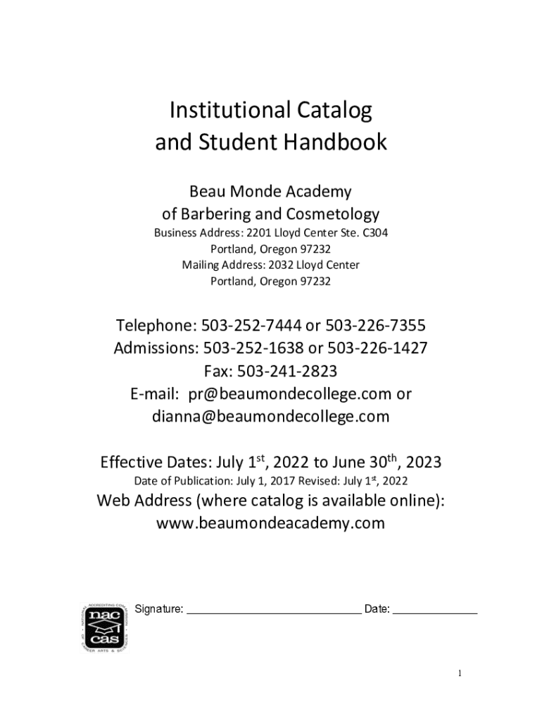 Institutional Catalog and Student Handbook Beau Mode Academy of Barbering and Cosmetology Business Address: 2201 Lloyd Center Ste. C304 Portland, Oregon 97232 Mailing Address: 2032 Lloyd Center Portland,
