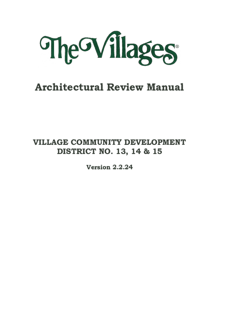 Architectural Review ManualVILLAGE COMMUNITY DEVELOPMENT DISTRICT NO. 13, 14 & 15 Version 2.2.24TABLE OF CONTENTS Alternative Energy Arbors Artificial Grass Awnings Bird Feeders Building Additions
