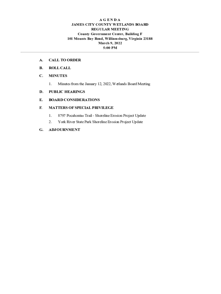 1. MinutesfromtheJanuary12,2022,WetlandsBoardMeetingD.PUBLICHEARINGSE.BOARDCONSIDERATIONSF.MATTERSOFSPECIALPRIVILEGEG.1.8797PocahontasTrailShorelineErosionProjectUpdate2.