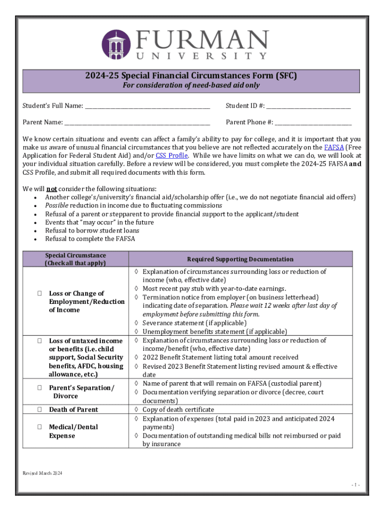 202425 Special Financial Circumstances Form (SFC) For consideration of need based aid only Students Full Name: ___Student ID #: ___Parent Name: ___Parent Phone #: ___We know certain situations and
