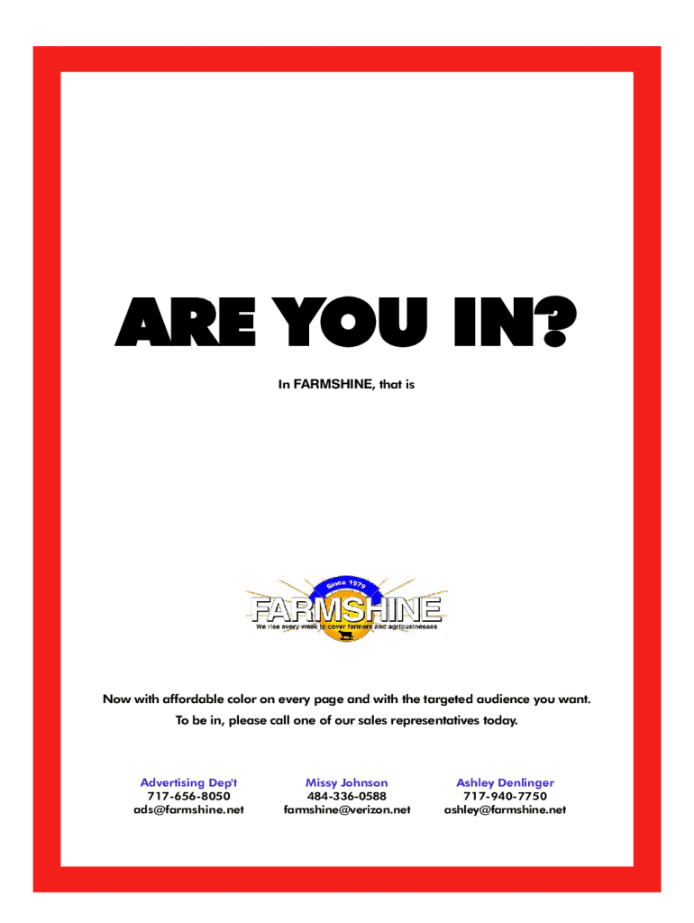 ARE YOU IN? In FARMSHINE, that isNow with affordable color on every page and with the targeted audience you want. To be in, please call one of our sales representatives today.Advertising Dep\'t 7176568050