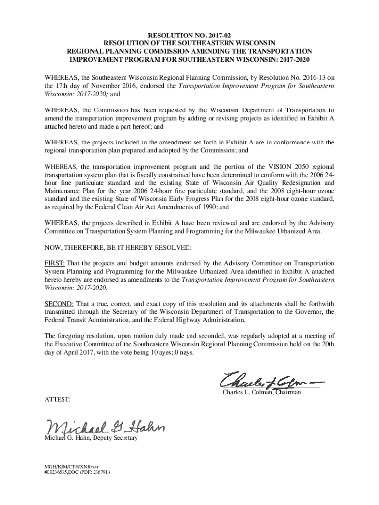 RESOLUTION NO. 201702 RESOLUTION OF THE SOUTHEASTERN WISCONSIN REGIONAL PLANNING COMMISSION AMENDING THE TRANSPORTATION IMPROVEMENT PROGRAM FOR SOUTHEASTERN WISCONSIN: 20172020 WHEREAS, the Southeastern
