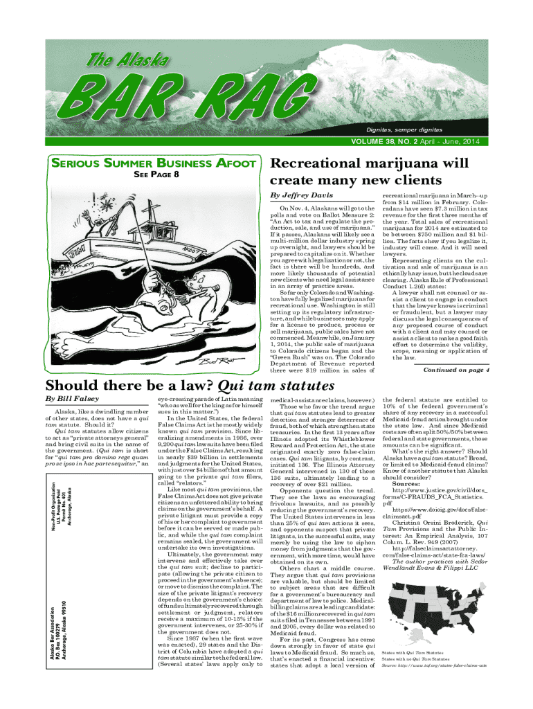 The Alaska RAGDignitas, temper dignitasVOLUME 38, NO. 2 April June, 2014Serious Summer Business Afoot Recreational marijuana Willie Page 8create many new clients By Jeffrey Davis On Nov. 4, Alaskans