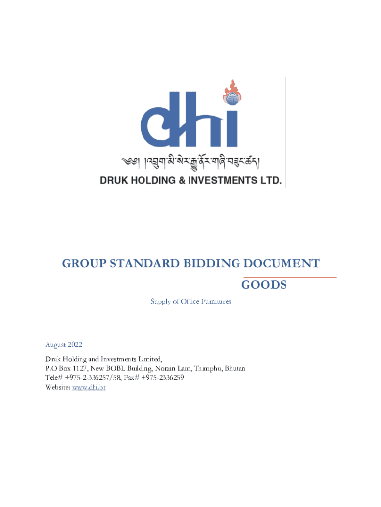 GROUP STANDARD BIDDING DOCUMENT GOODS Supply of Office FurnituresAugust 2022 Drug Holding and Investments Limited, P. O Box 1127, New BOB Building, Norman Lam, Thimphu, Bhutan Tell# +9752336257/58,