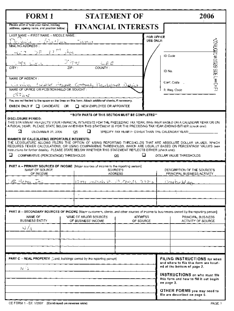 FORM 1 STATEMENT OF 2006 Please print or type your name, mailing a dd less, agency name, a d POS it on b e l ow:FINANCIAL INTERESTSILAST NAME FIRST NAME MIDDLE NAME : FOR OFFICE v1Y. ., \'i,1^; USE