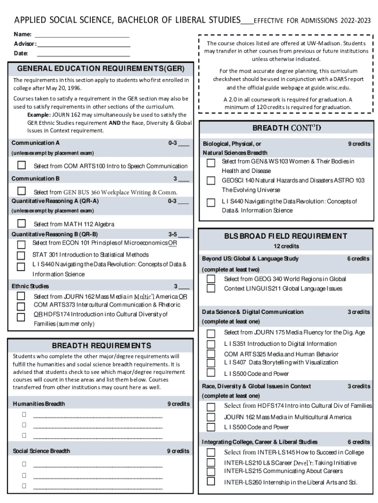 APPLIED SOCIAL SCIENCE, BACHELOR OF LIBERAL STUDIES Name: Advisor: Date:EFFECTIVE FOR ADMISSIONS 20222023The course choices listed are offered at UWMadison. Students may transfer in other courses