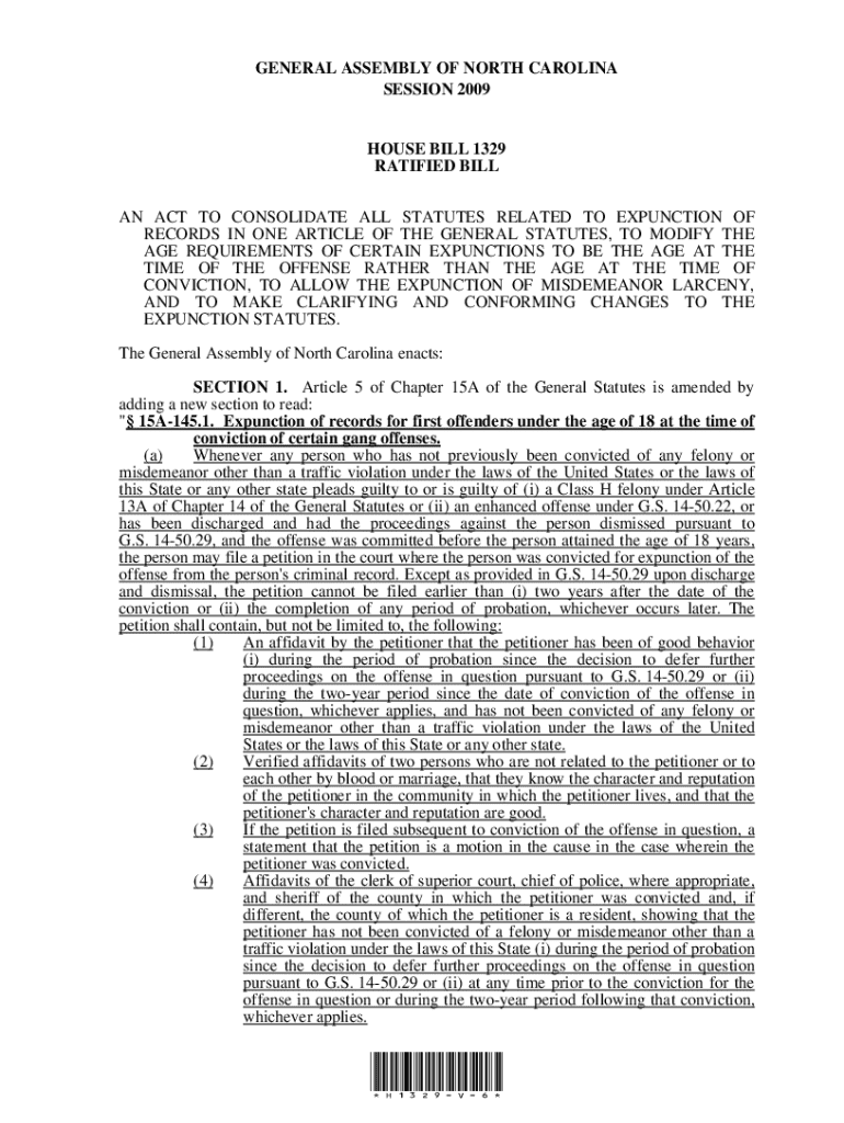 GENERAL ASSEMBLY OF NORTH CAROLINA SESSION 2009HOUSE BILL 1329 RATIFIED BILL AN ACT TO CONSOLIDATE ALL STATUTES RELATED TO EXPUNCTION OF RECORDS IN ONE ARTICLE OF THE GENERAL STATUTES, TO MODIFY THE