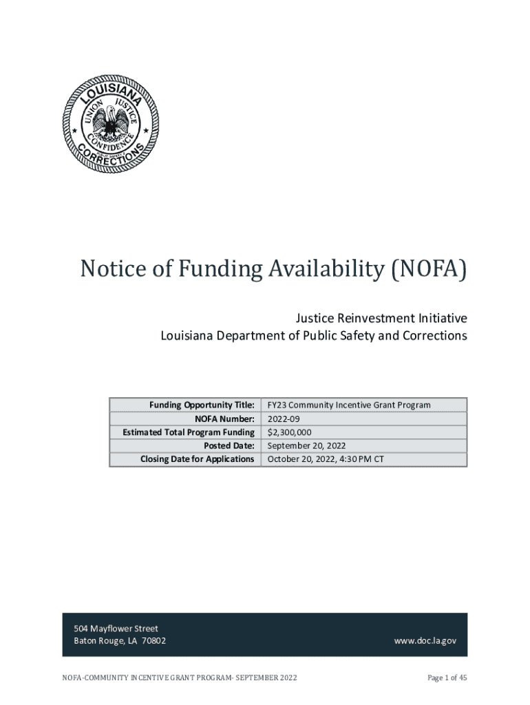 Notice of Funding Availability (NOFA)Justice Reinvestment Initiative Louisiana Department of Public Safety and CorrectionsFunding Opportunity Title: NOFA Number: Estimated Total Program Funding Posted