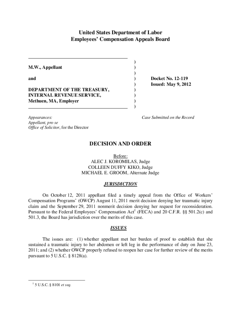 United States Department of Labor Employees Compensation Appeals Board ___ M.W., Appellant and DEPARTMENT OF THE TREASURY, INTERNAL REVENUE SERVICE, Methuen, MA, Employer ___)) )) )) )) )Appearances: