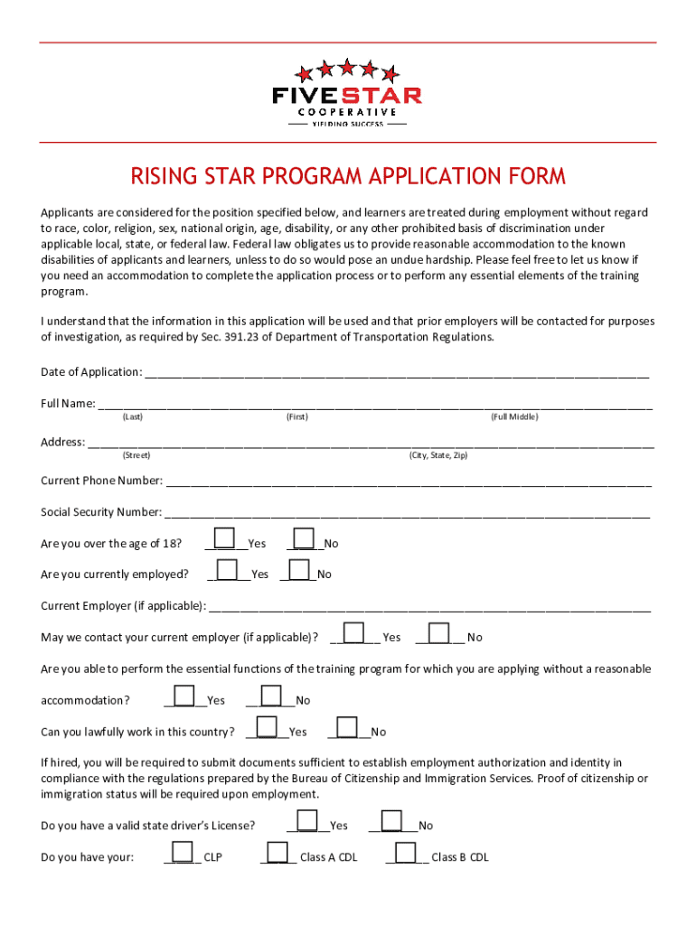 RISING STAR PROGRAM APPLICATION FORM Applicants are considered for the position specified below, and learners are treated during employment without regard to race, color, religion, sex, national origin,