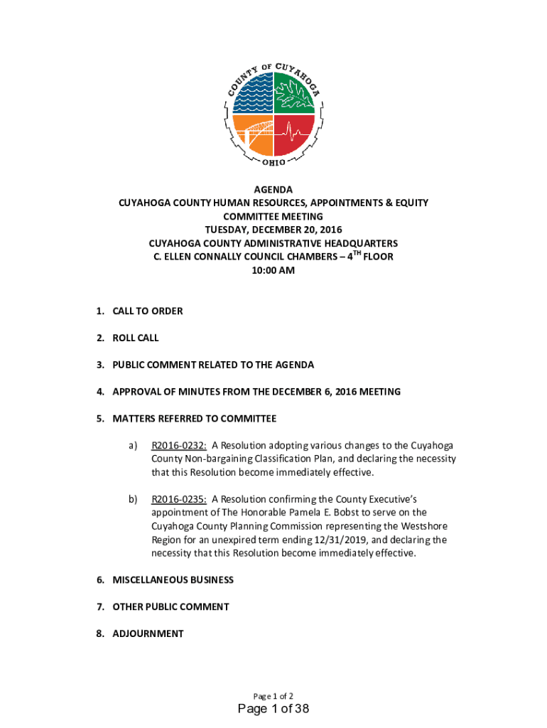 AGENDA CUYAHOGA COUNTY HUMAN RESOURCES, APPOINTMENTS & EQUITY COMMITTEE MEETING TUESDAY, DECEMBER 20, 2016 CUYAHOGA COUNTY ADMINISTRATIVE HEADQUARTERS C. ELLEN CONNALLY COUNCIL CHAMBERS 4TH FLOOR