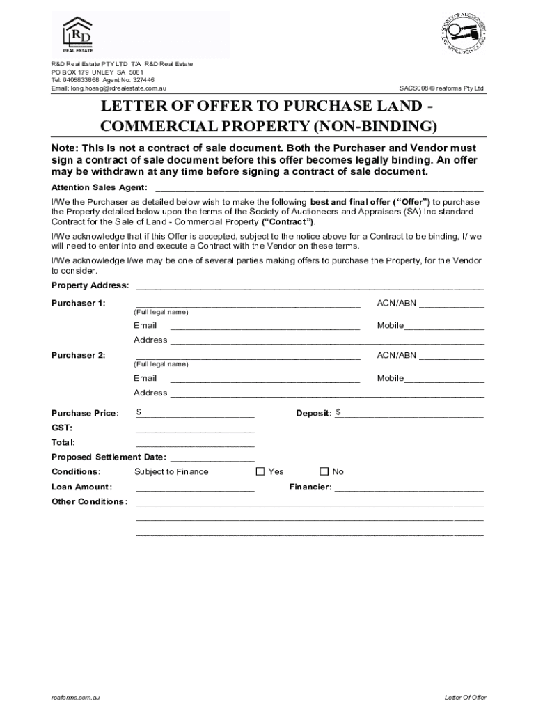 R&D Real Estate PTY LTD T/A R&D Real Estate PO BOX 179 UNLAY SA 5061 Tel: 0405833868 Agent No: 327446 Email: long.hoang@rdrealestate.com.auSACS008 reforms Pty Letter OF OFFER TO PURCHASE LAND COMMERCIAL