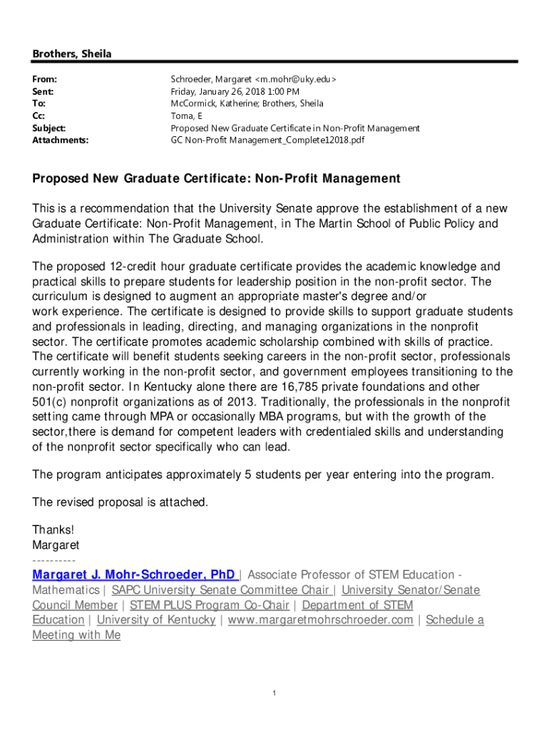 Brothers, Sheila From: Sent: To: Cc: Subject: Attachments:Schroeder, Margaret m.mohr@uky.edu Friday, January 26, 2018 1:00 PM McCormick, Katherine; Brothers, Sheila Toma, E Proposed New Graduate Certificate
