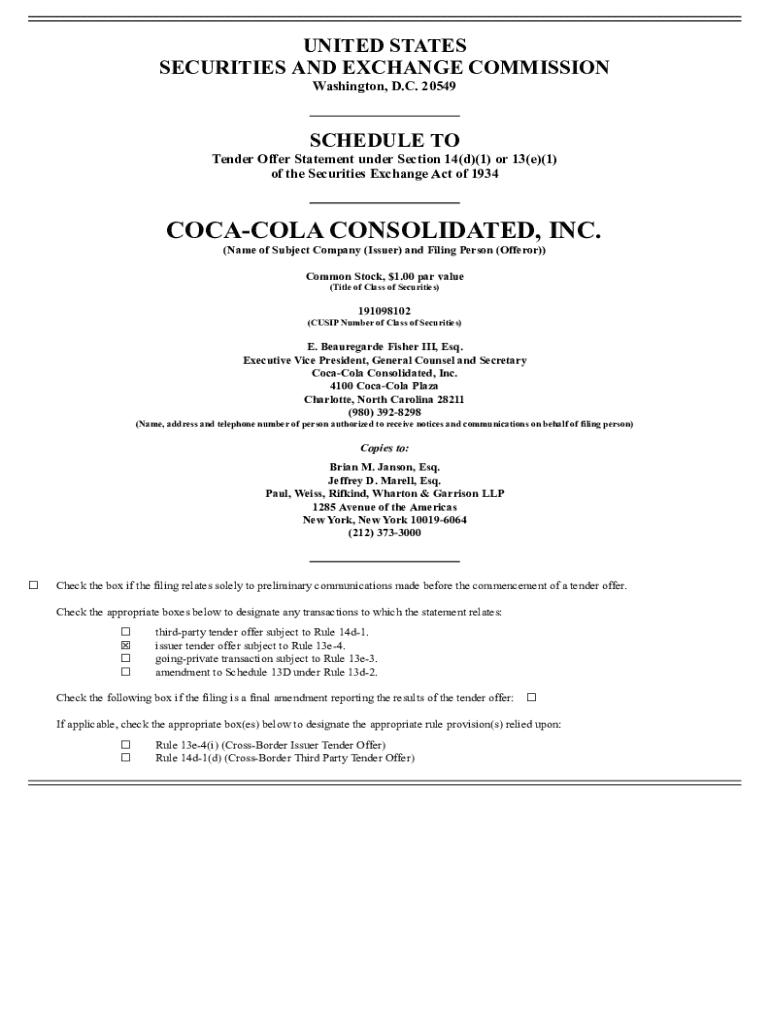 UNITED STATES SECURITIES AND EXCHANGE COMMISSION Washington, D.C. 20549 SCHEDULE TO Tender Offer Statement under Section14(d)(1) or 13(e)(1) of the Securities Exchange Act of 1934 COCACOLA CONSOLIDATED,