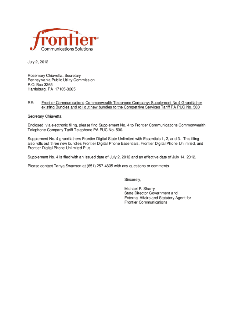 July 2, 2012Rosemary Ciabatta, Secretary Pennsylvania Public Utility Commission P.O. Box 3265 Harrisburg, PA 171053265RE:Frontier Communications Commonwealth Telephone Company; Supplement No.4 Grandfather