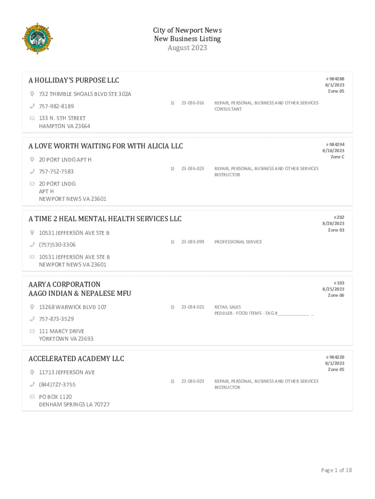City of Newport News New Business Listing August 2023# 984288 8/1/2023 Zone 05A HOLIDAY\'S PURPOSE LLC 732 THIMBLE SHOALS BLVD STE 302A 75798281891)23036016REPAIR, PERSONAL, BUSINESS AND OTHER SERVICES