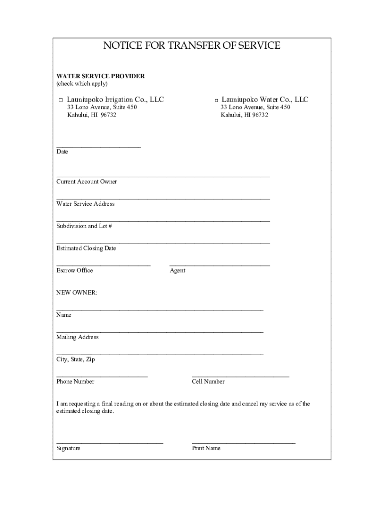 NOTICE FOR TRANSFER OF SERVICE