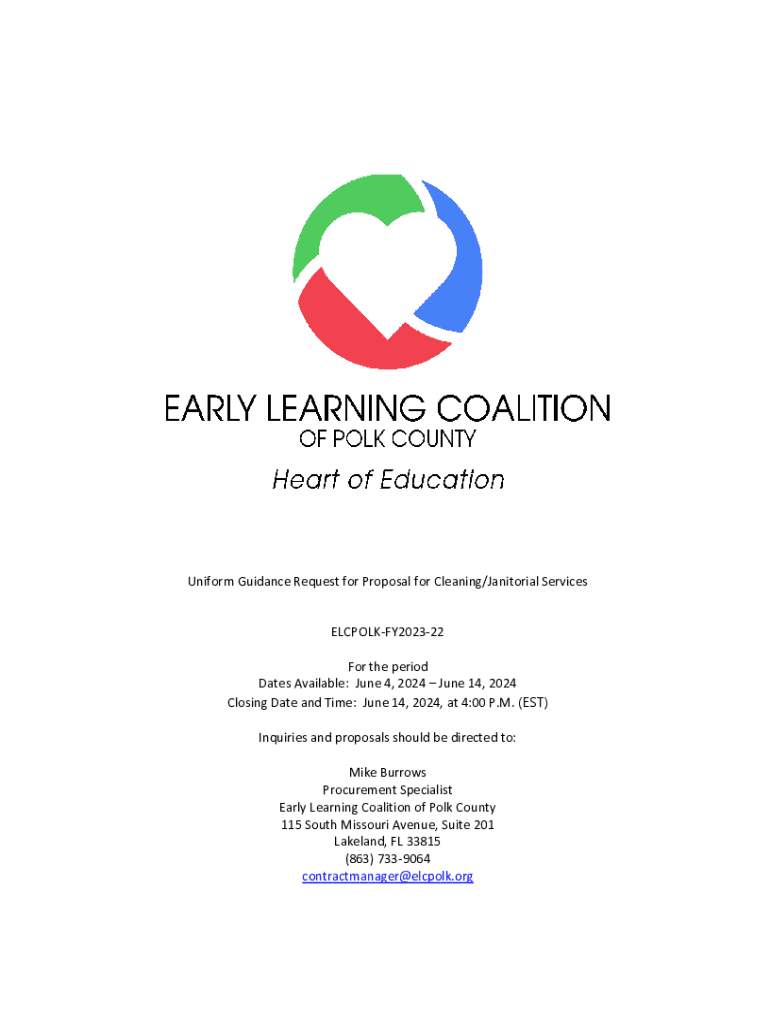 Uniform Guidance Request for Proposal for Cleaning/Janitorial Services ELCPOLKFY202322 For the period Dates Available: June 4, 2024, June 14, 2024, Closing Date and Time: June 14, 2024, at 4:00 P.M.