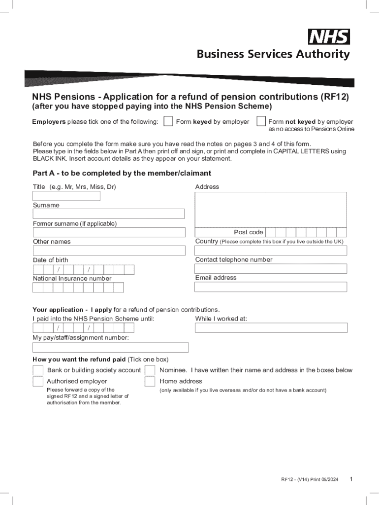 NHS Pensions Application for a refund of pension contributions (RF12) (after you have stopped paying into the NHS Pension Scheme)Employers please tick one of the following:Form keyed by employerForm