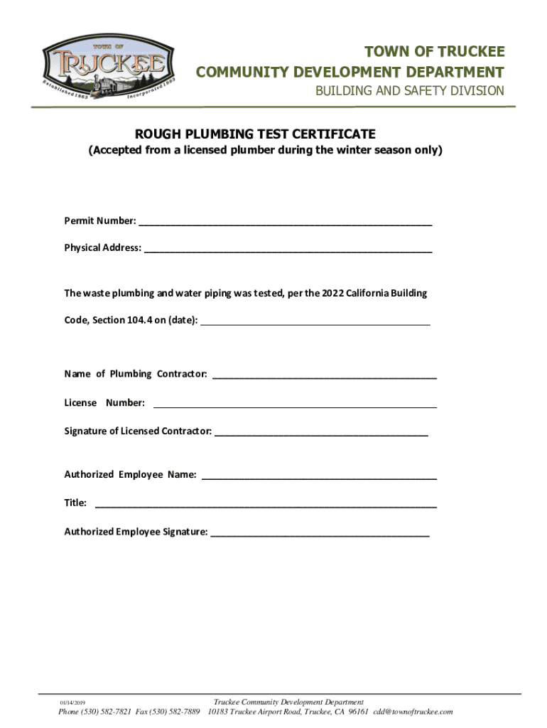 TOWN OF TRUCKEE COMMUNITY DEVELOPMENT DEPARTMENT BUILDING AND SAFETY DIVISION ROUGH PLUMBING TEST CERTIFICATE (Accepted from a licensed plumber during winter only)Permit Number: ___ Physical Address: