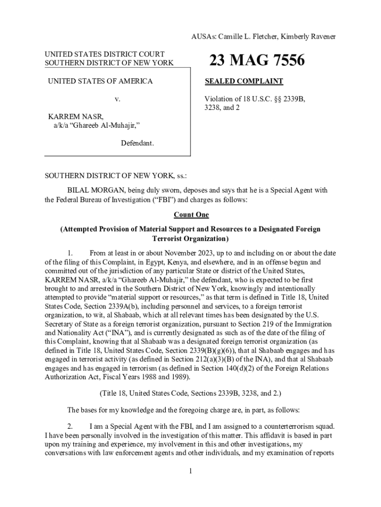 Auras: Camille L. Fletcher, Kimberly Ravener23 MAG 7556UNITED STATES DISTRICT COURT SOUTHERN DISTRICT OF NEW RESEALED COMPLAINTUNITED STATES OF Americanization of 18 U.S.C. 2339B, 3238, and 2v. KAREEM
