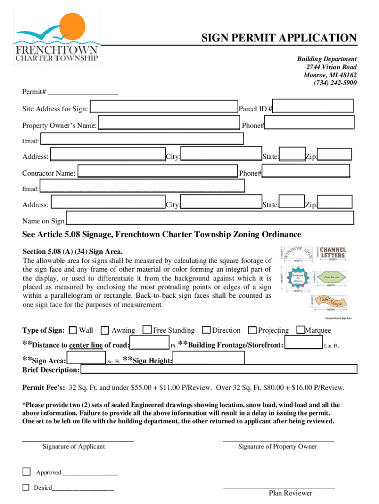 SIGN PERMIT APPLICATION Building Department 2744 Vivian Road Monroe, MI 48162 (734) 2425900Permit# ___ Site Address for Sign: ___Parcel ID #___ Property Owners Name: ___ Phone#___ Email: ___Address: