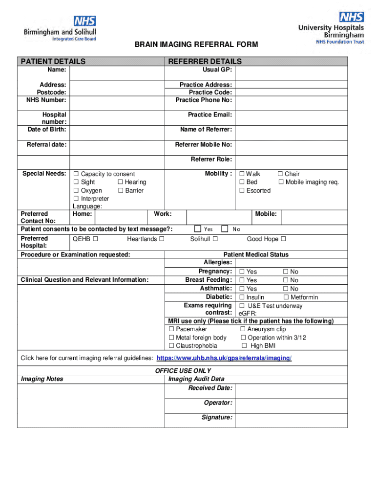 BRAIN IMAGING REFERRAL FORM PATIENT DETAILSREFERRER DETAILSName:Usual GP:Address: Postcode: NHS Number:Practice Address: Practice Code: Practice Phone No:Hospital number: Date of Birth:Practice Email: