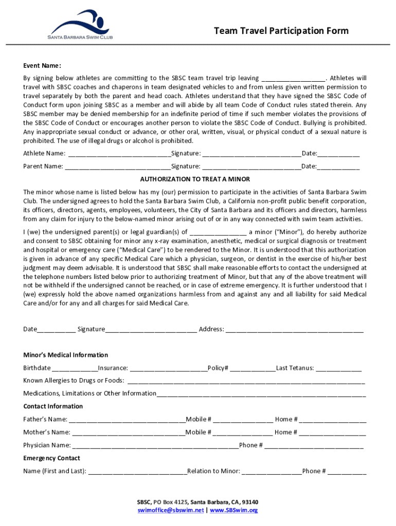 Team Travel Participation Forewent Name:BysigningbelowathletesarecommittingtotheSBSCteamtraveltripleaving___. Athleteswilltravel with SBS coaches and chaperons in team designated vehicles to and from unless given written permission totravelseparatelybyboththeparentandheadcoach.