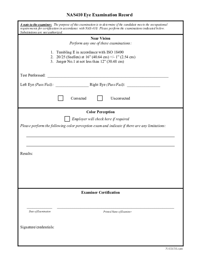 NAS410 Eye Examination Record A note to the examiner: The purpose of this examination is to determine if the candidate meets the occupational requirements for certification in accordance with NAS410.